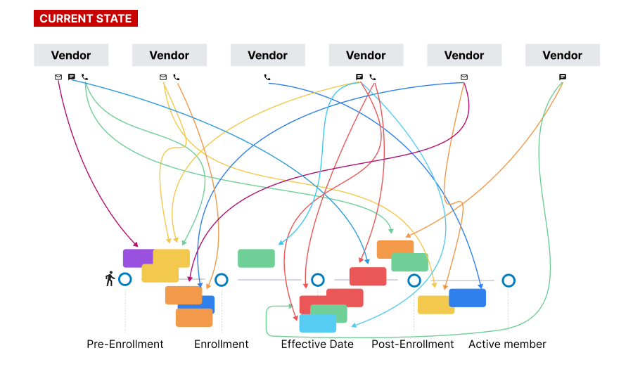 Conceptual diagram showcasing the chaotic experience members have throughout the plan lifecycle, constantly receiving outreaches from multiple vendors without any coordination.