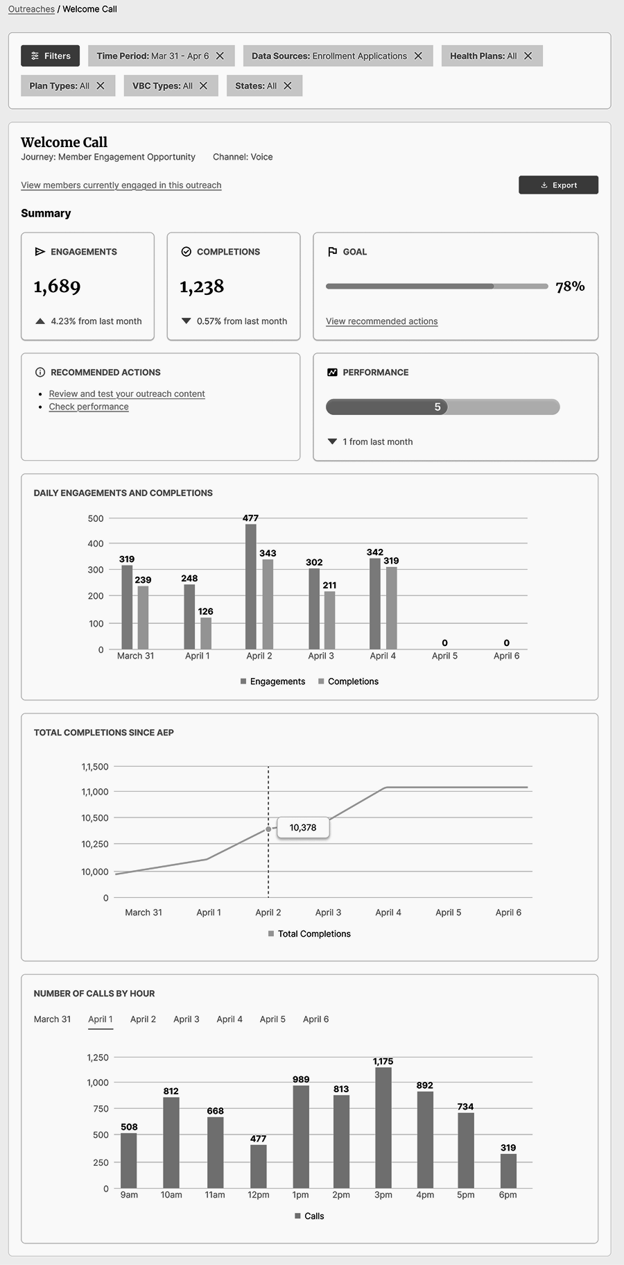 An early design concept showcasing dashboard-like content that would appear when a health plan user navigated to an outreach’s performance page.