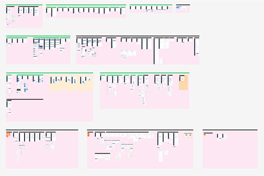 A high level view of the number of screens designed for the various flows implemented in the platform. This screenshot shows less than 1/3 of all screens created, not including conceptual design exploration screens.