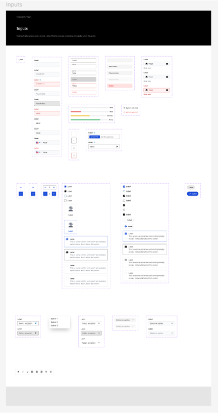 In parallel with designing the platform’s core workflows, I built a design system to ensure standardization, flexibility, and faster delivery. The system included foundations (typography, spacing, colors, shadows), reusable components (buttons, inputs, panels, modals), and patterns (navigation, tables, forms). Centralized in a shared Figma library, it cut design time, ensured cohesion, and provided developers with clear specifications.